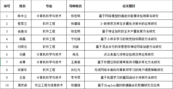 (备注:院级优秀学位论文具体评选工作由各答辩小组完成,获评比例为参加答辩毕业生人数的20%。优秀学位论文获得者,其导师被授予优秀指导教师称号。)