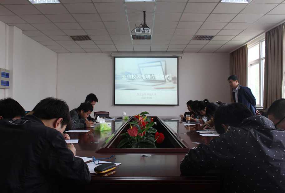 考虑到亚信集团在西安招聘的地理位置较偏远,学生们赴西安参加笔试费时费力,所以成人社区 为学生们组织了一场微信专场笔试。笔试时间与西安交大同步,下午四点学生们统一坐在组织会场内,根据微信笔试指导书的指示连接WiFi、登陆、测试。经过一小时的认真作答,学生们陆续完成笔试,并加入“亚信校招成人社区 ”微信群,通过微信群接收笔试结果和公司有关的资讯。