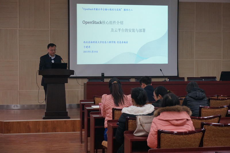 于建涛博士从云计算与高性能计算的分析比较方面着手,重点阐述了OpenStack所具备的主要功能,并针对自己在科学研究过程中所遇到的主要问题,阐述了解决思路和办法。在报告现场演示了一个OpenStack的云平台示例,通过Web网页图形化界面,分别从 “管理员”、“用户”的角度,描述了二者在管理、分配、申请云计算资源过程中被赋予的任务和权限等,使与会人员对云计算平台有了一个直观的了解。刘斌博士针对当前云计算和大数据领域的研究热点和关键技术进行了讲解,就自己的研究领域进行了详细阐述,结合教育行业给出了基于OpenStack云平台的解决方案,并针对云平台在教育教学中的应用提出新的思路和理念。