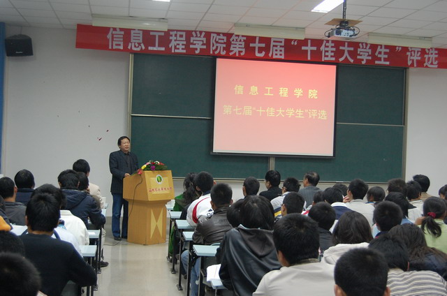优良学风建设,积极营造健康和谐的校园文化氛围,有效提高广大同学的综合素质,培养更多具有创新精神和实践能力的高素质人才,11月20日晚,我院第七届“十佳大学生”评选大会在多媒体教室举行。全体院领导、综合办公室秘书、全体学工干部以及200余名学生代表参加了评选大会。评选会由谷申杰同志主持。