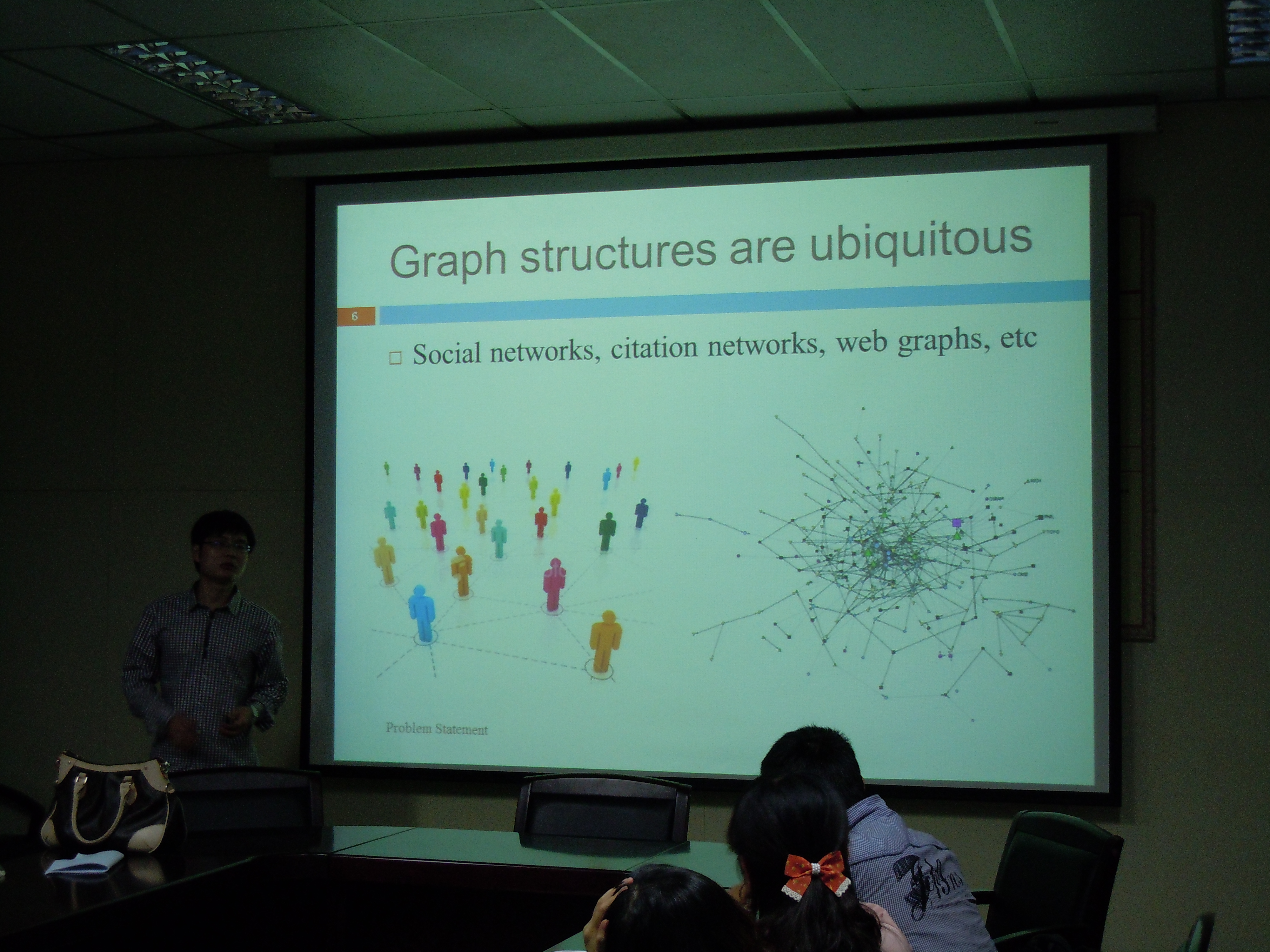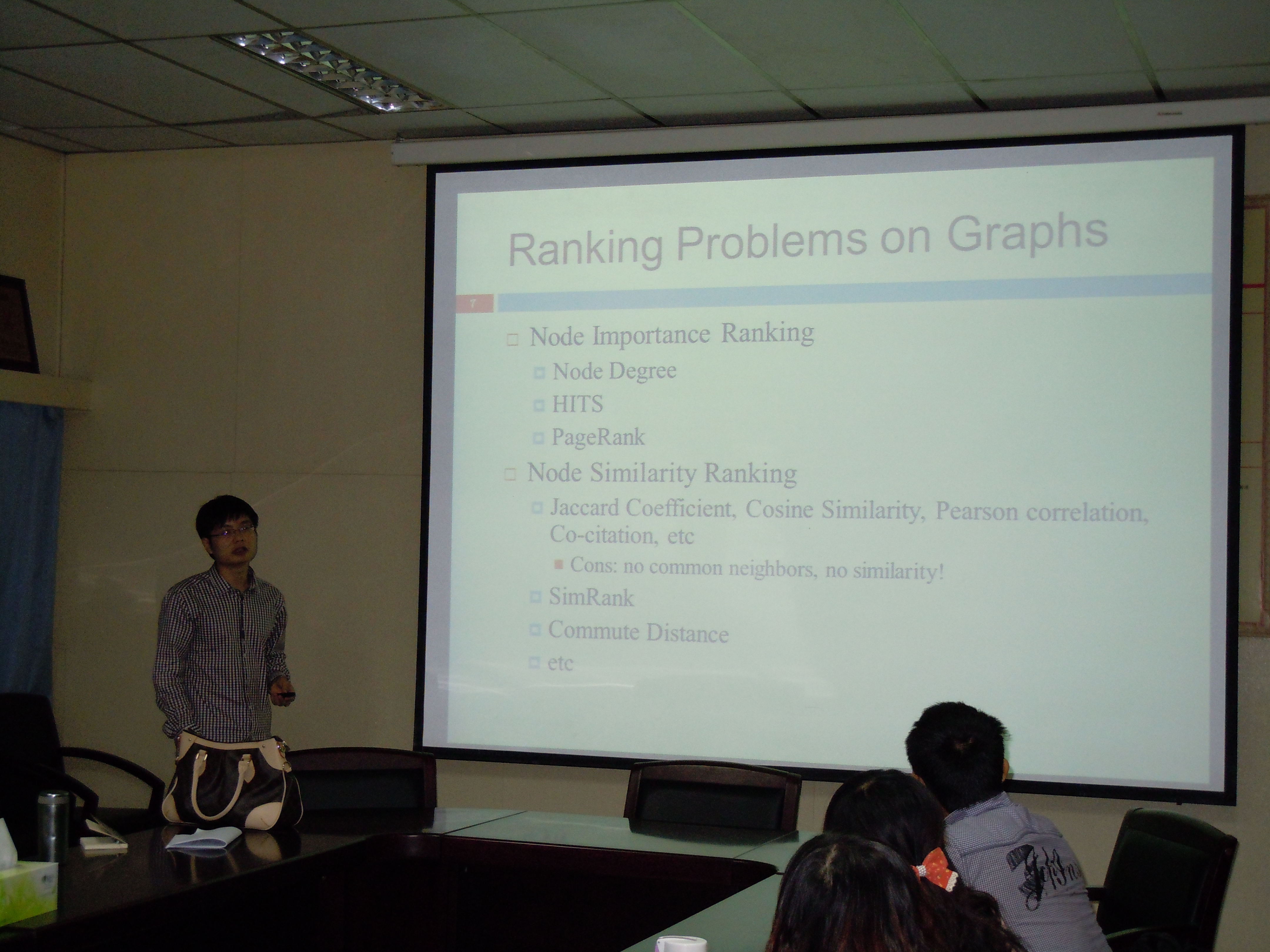 会议室为师生作了题为“Top-K Similarity Search on Graph Data”的学术报告。他介绍了图数据管理与挖掘,社交网络流查询与挖掘的研究动态。然后,简述了数据挖掘方面的经典算法和案例,主要包括PageRank算法以及SimRank算法的原理、实例,着重讲解了图数据管理与挖掘的应用。在报告的最后,李佩博士还和大家分享了自己的求学经历,与各位师生交流了研究心得与经验,就图挖掘领域的一些问题进行了探讨,取得了良好的效果。
