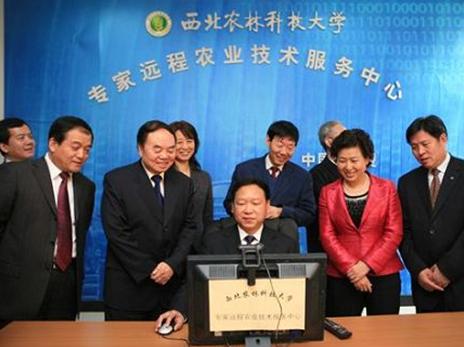 院长何东健教授对我校自主研发的农业远程培训系统、农业专家远程视频咨询系统、农业远程可视化系统、气象农田数据远程采集系统以及农业技术培训网络课程的汇报。周济部长兴致勃勃地观看了专家远程农业技术服务系统运行状况,与正在为农民培训的白水苹果试验示范站首席专家赵政阳教授通话,并亲切问候正在培训的农民朋友。