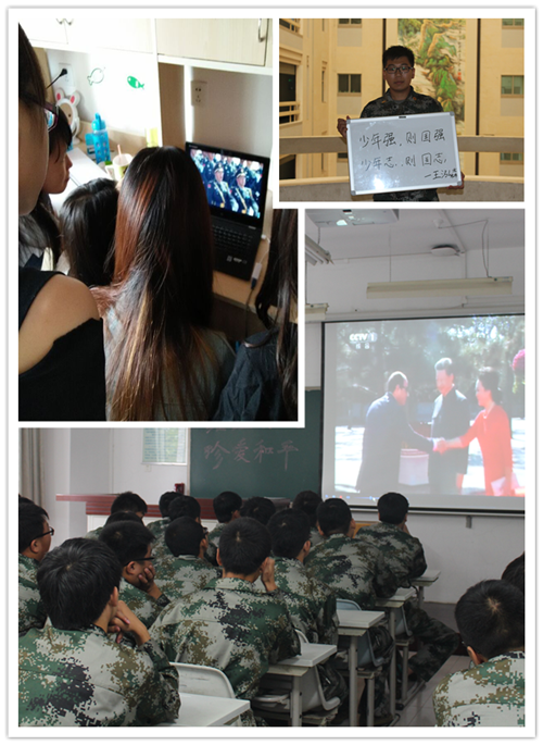 朝气蓬勃的精神面貌、坚定豪迈的步伐、引人瞩目的新式装备、雄浑激昂的国歌声军乐声……气势恢宏的阅兵仪式让师生无不感到热血沸腾,不少学生甚至主动站立军姿看完全程。仪式结束后,大家激动地心情久久不能平复,或在现场或在QQ群中开起了小型交流会,纷纷表达爱国之情,抒发民族自豪感。