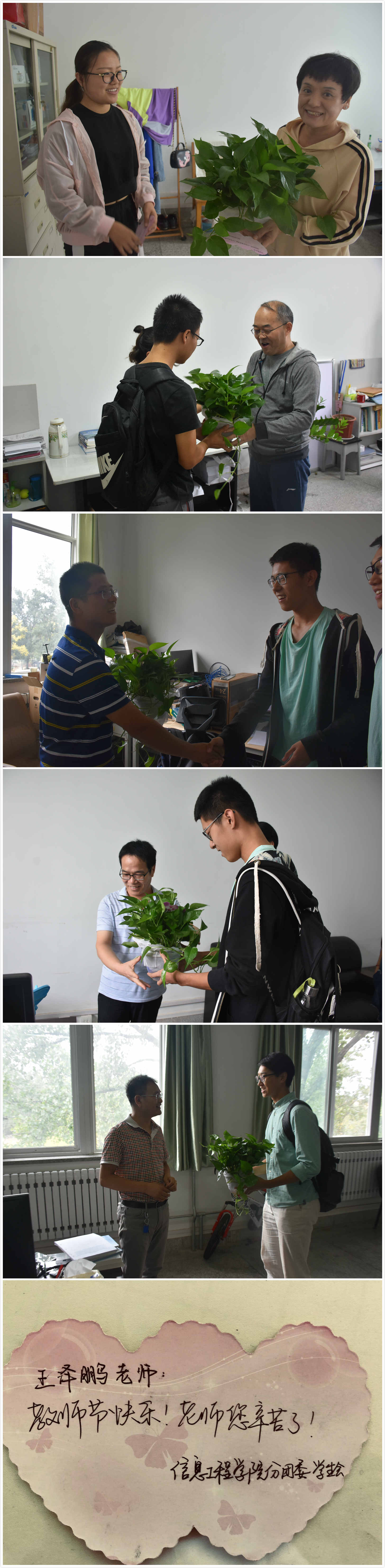 在教师节前的最后一个工作日,成人社区 30余名学生干部代表全院学生手捧绿萝和精心撰写的小卡片来到成人社区 办公楼,为每一位敬爱的老师送上他们节日的祝福。