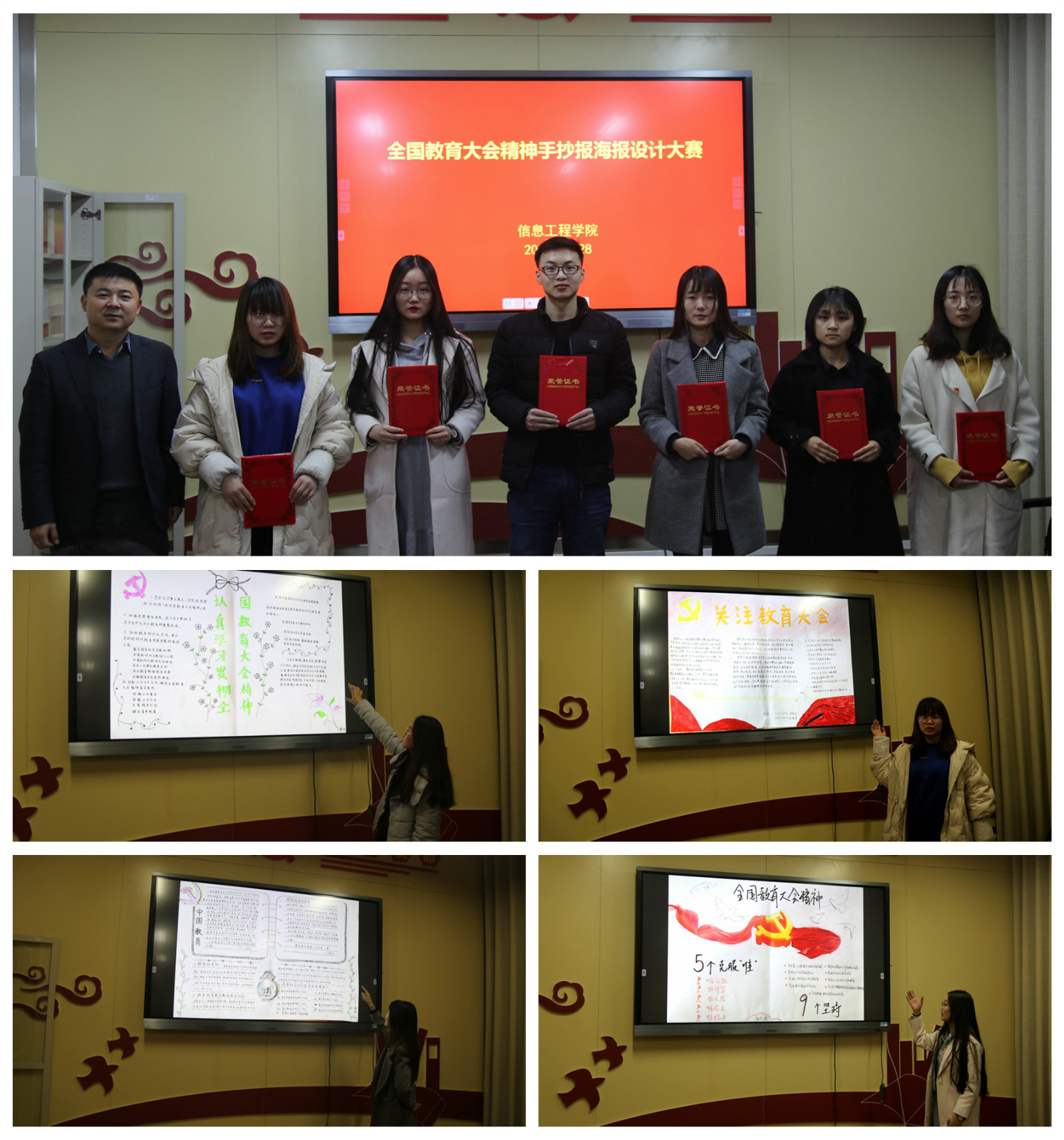 获奖选手分别上台,对各自设计的手抄报和海报进行了阐述。本科生第一党支部的蔡鑫颖获得了三等奖,她谈到:“每位求学的学生都应该把自己当作是一个瓶子,时刻怀着谦虚谨慎的态度从老师那里求取知识、真理,作为学生,我们是教育工作的最大受益者,要珍惜来之不易的学习机会,牢记习近平总书记的嘱托,像海绵汲水一样努力学习,不断进取。”