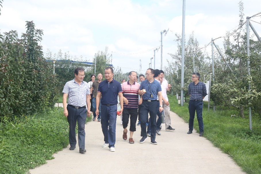 党支部一行首先来到成人社区 洛川苹果试验示范站,参观了苹果抗逆优质新品种培育试验田,试验站负责人介绍了苹果优质苗木繁育技术、旱(山)地苹果优质安全高效栽培技术和苹果省力化栽培技术及机械等。对于苹果文化与产业经济的发展,试验站负责人向大家介绍了用站内苹果制作的白酒、白兰地、朗姆酒等产品的原料生产、加工工艺、研发情况等。支部成员与试验站技术人员深入探讨了品种选育、果树栽培、果酒酿造等过程中信息化技术的运用与发展。