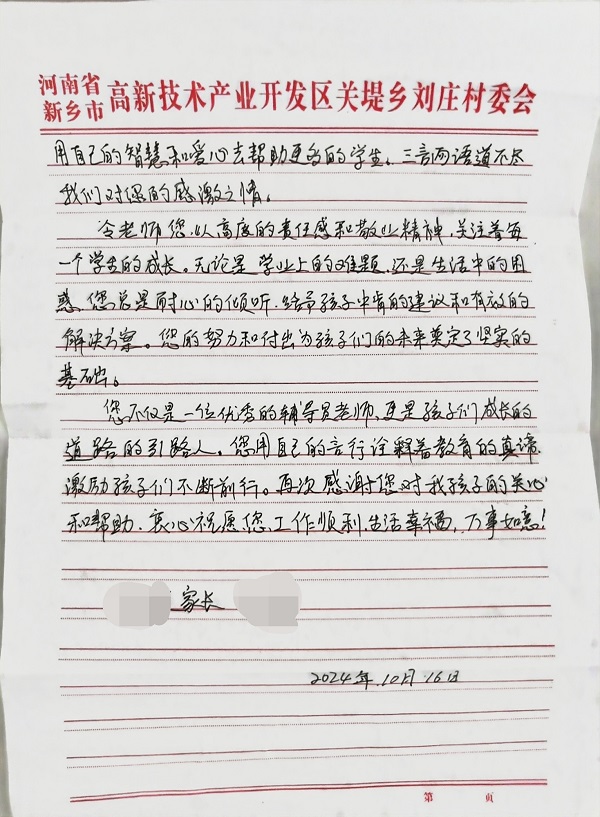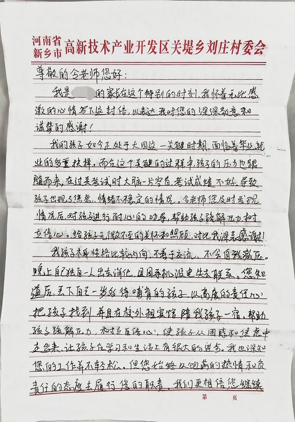 “令阳老师在凌晨放下自己一岁多哺育的孩子,毅然前来帮助我的孩子。您不仅是一位优秀的辅导员,更是孩子们成长路上的明灯,您用言行诠释了教育的真谛,激励孩子们不断向前!”近日,成人社区 收到了一封感人至深的感谢信,信中2021级软件小唐(化名)的母亲用朴素平实的语言讲述了,成人社区 辅导员令阳对其孩子无微不至的关怀和照顾,字里行间满是感激之情。