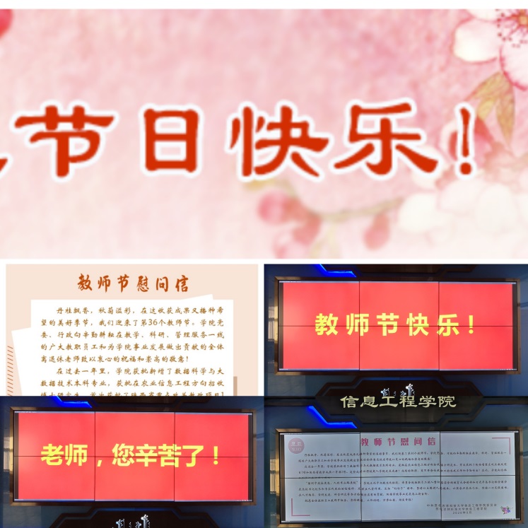 广泛宣传,营造浓厚氛围。在第36个教师节来临之际,我院在网站悬挂了“老师,您辛苦了!祝您节日快乐!”的横幅,发布了设计精美的致全院教职工的一封信,对全院教职工表达了节日慰问;还通过电子屏持续为教师亮灯,滚动播放了“老师,您辛苦了!”“教师节快乐!”等暖心话语。