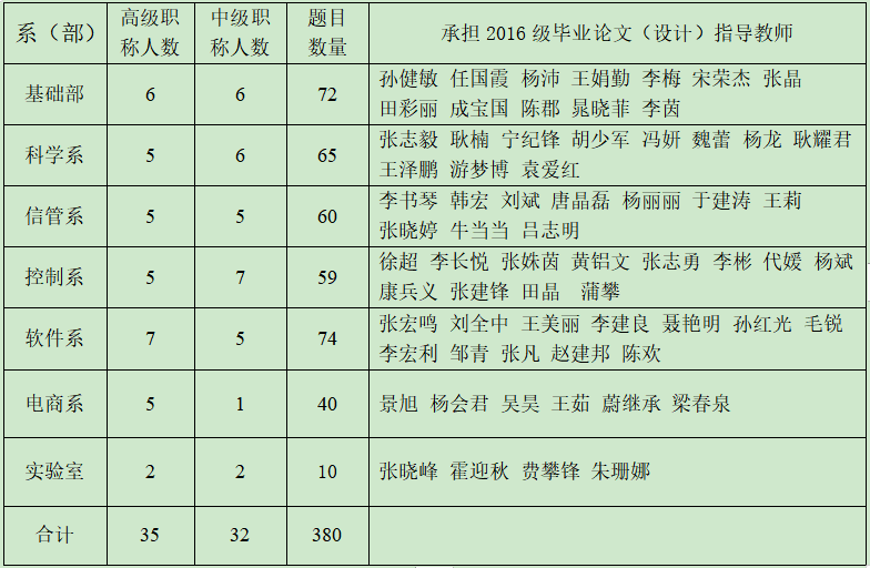 根据学校本科毕业论文(设计)工作规范要求,指导教师应有实际的设计、实验或研究工作经验,能为人师表,对学生思想品德的陶冶起有益的作用,即指导教师既要教书,又要育人。对毕业论文(设计)的业务指导,应把重点放在培养学生的独立工作能力和创新能力方面。为保证学生毕业论文(设计)质量,结合我院实际,高级职称指导教师指导学生人数不超过7人,中级职称指导教师指导学生人数不超过5人(正在攻读学位的教师独立指导学生人数不超过3人)。按以上规定计算,各系(部)拟提交的本科毕业论文(设计)题目数不超过表中数量。