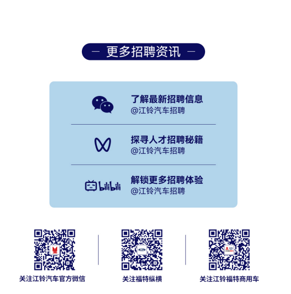 江铃汽车招聘微信公众号:微信搜索【江铃汽车招聘】
