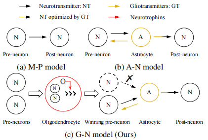 该研究针对现有M-P模型在训练过程中被锁定,导致由其构建的第二代神经网络(如CNN)过拟合和过参数化的问题。该研究工作引入了由胶质细胞和神经元组成的多细胞协同单元,以模拟哺乳动物大脑的精确工作流程,从而增强神经功能的生物学合理性。该研究首先提出了人工胶质-神经元 (G-N) 模型。然后,基于G-N模型构建了GliaNet,其结构和连接可以在训练过程中持续优化。实验表明,我们的GliaNet在分类数据集(CIFAR、ImageNet)上将准确率提高了0.08%-2.93%;在分割数据集(COCO)上将平均精度提高了 0.8%-1.0%;同时减少网络超过50%的参数量。