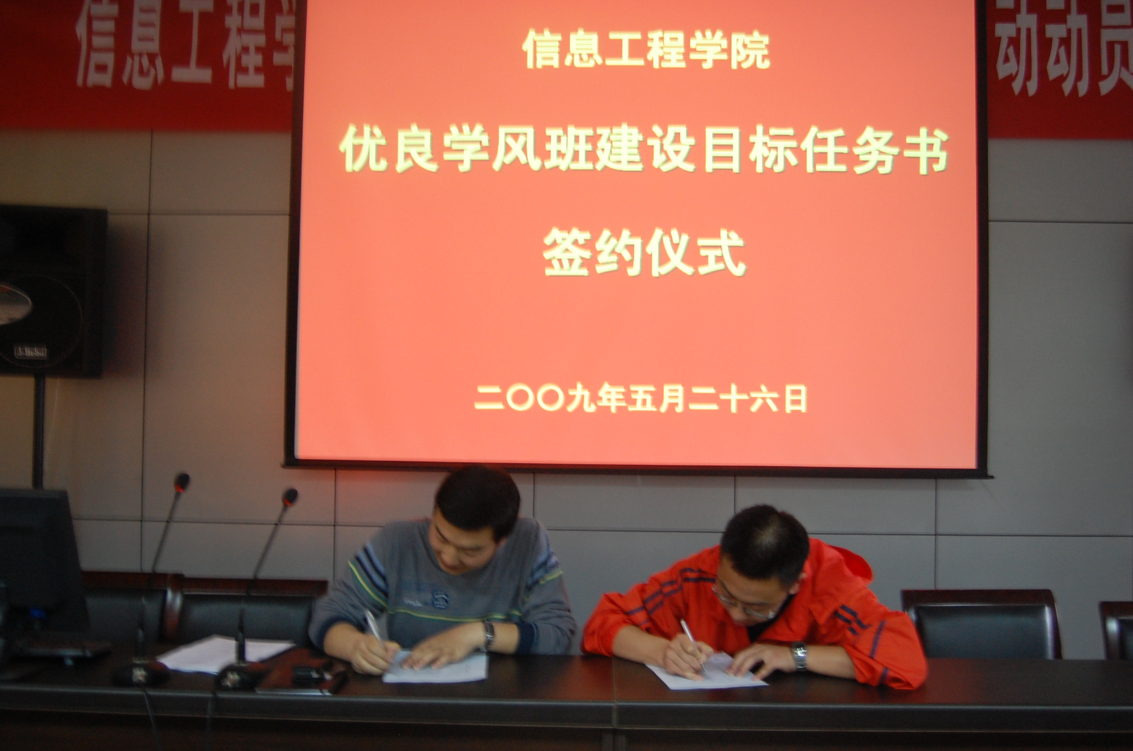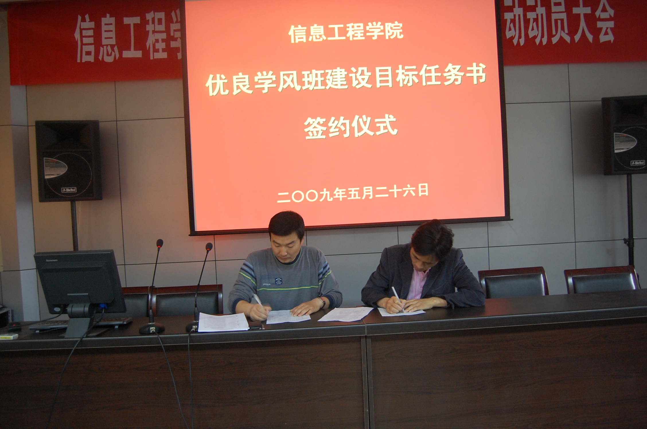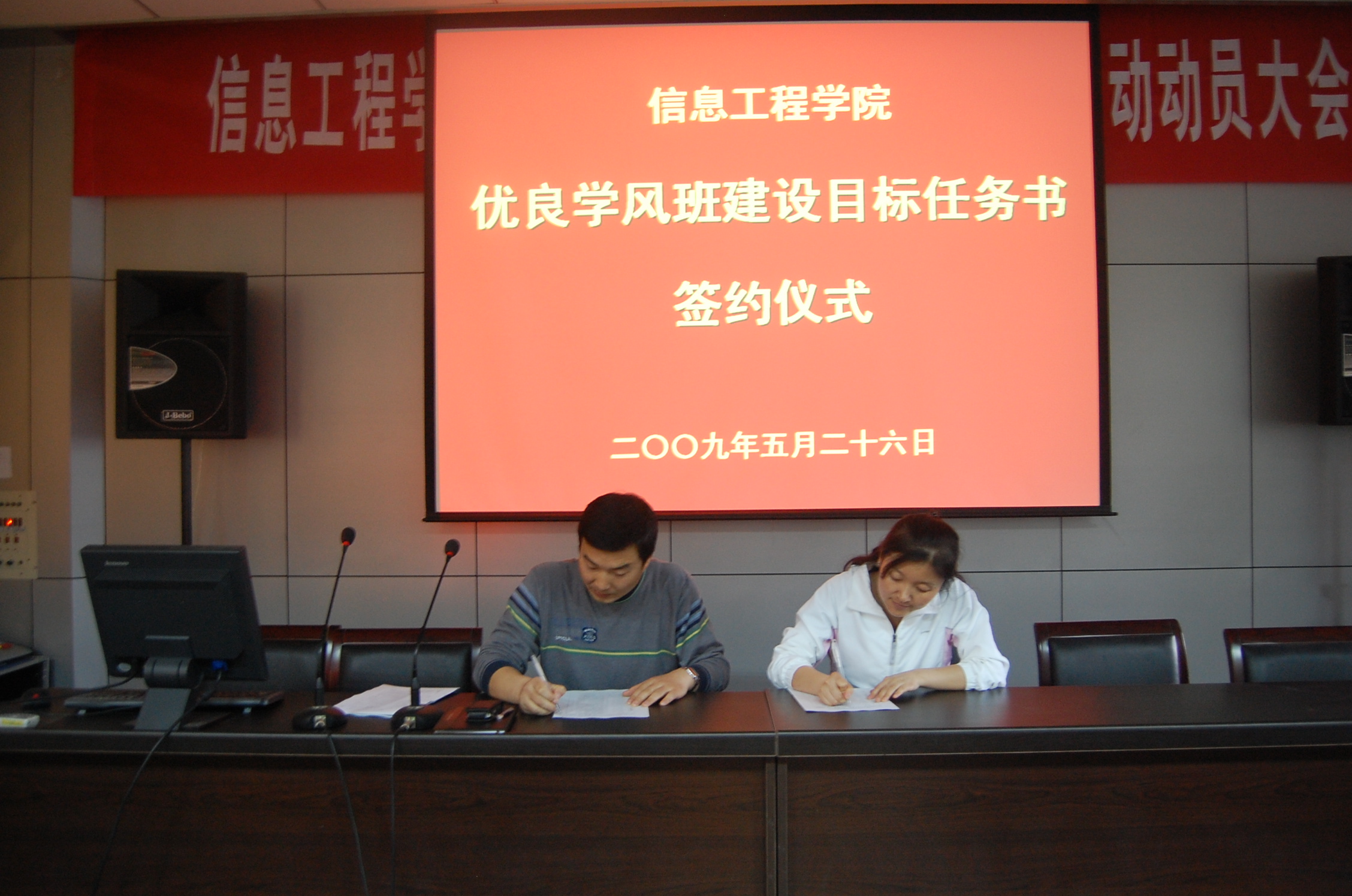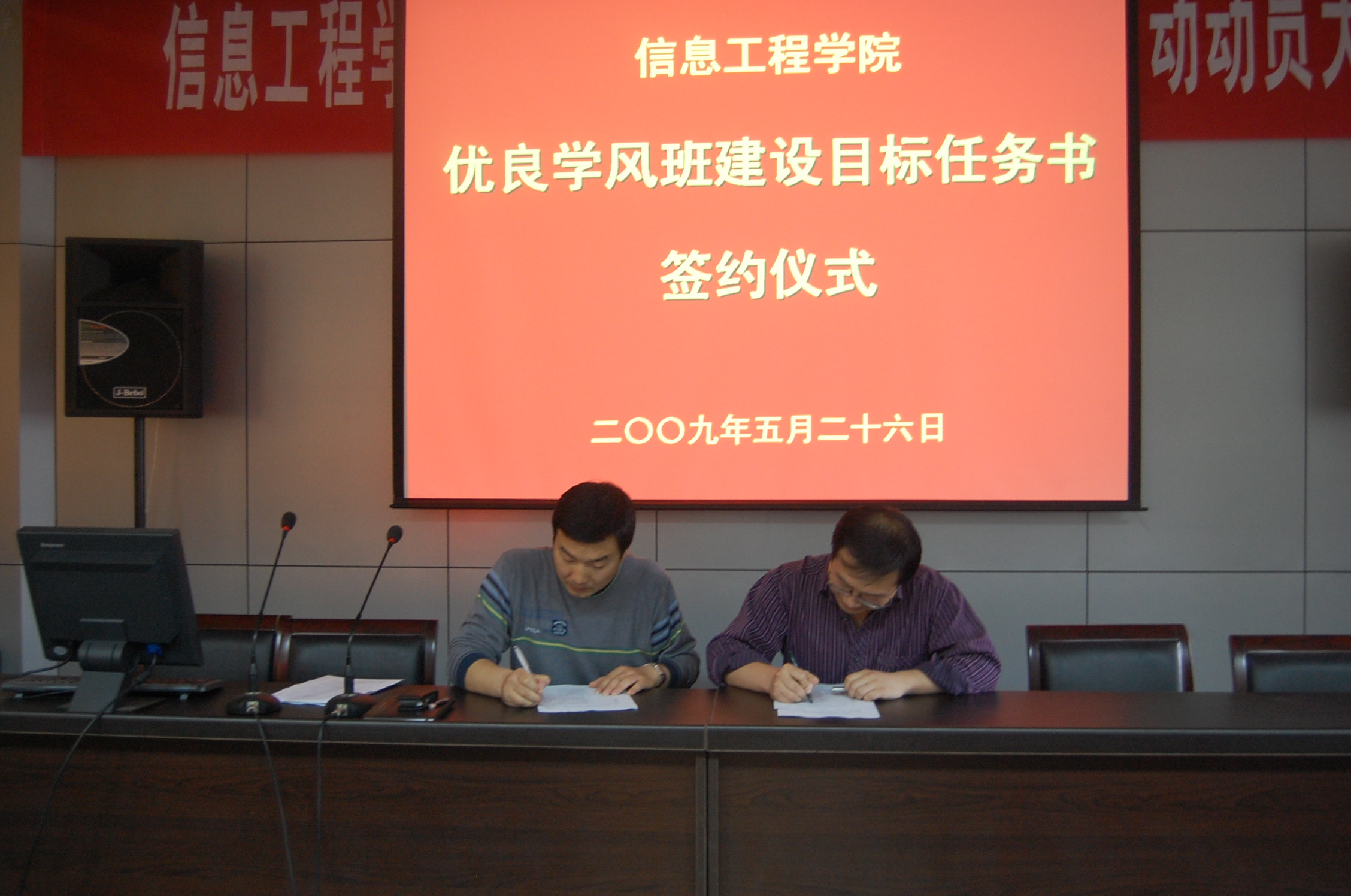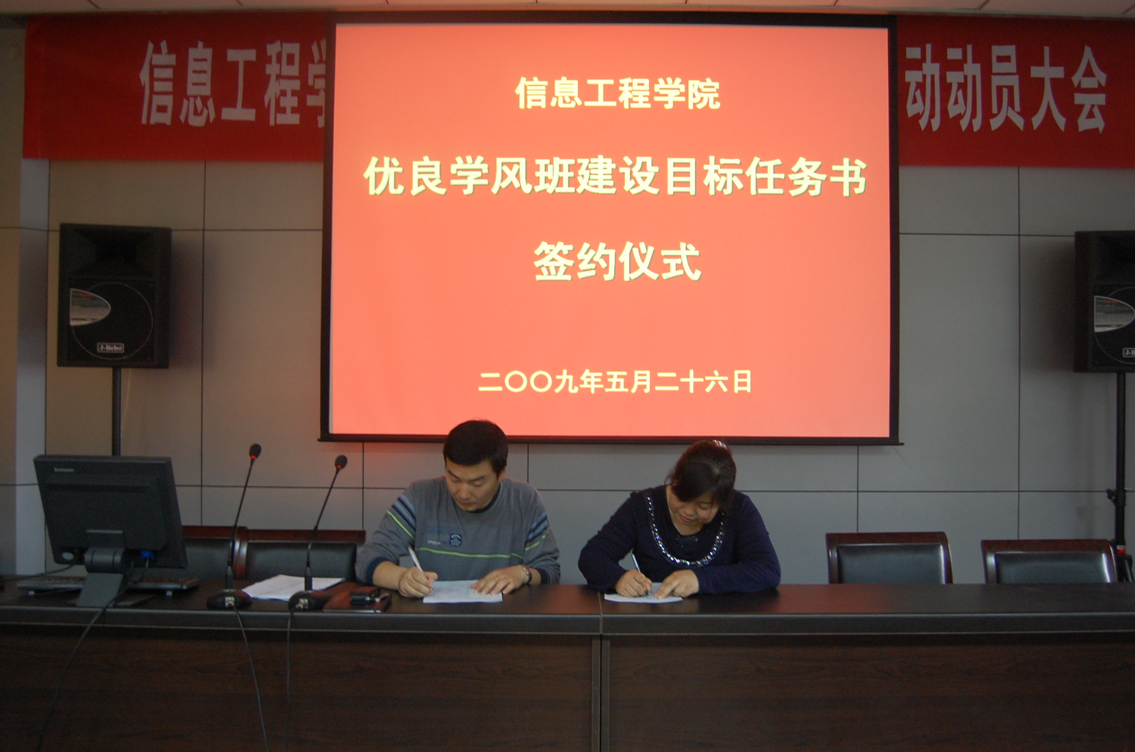 在二楼会议室举行了举行优良学风班建设目标任务书签约仪式。全体辅导员和班主任参加了会议,会议由党委副书记何卫军主持。